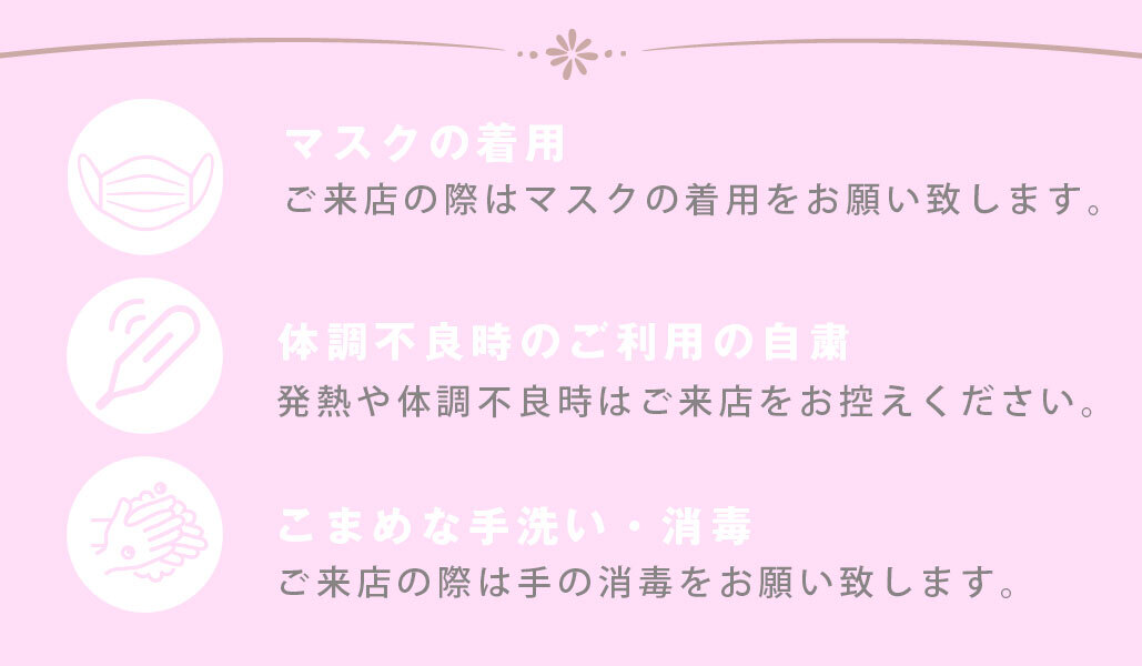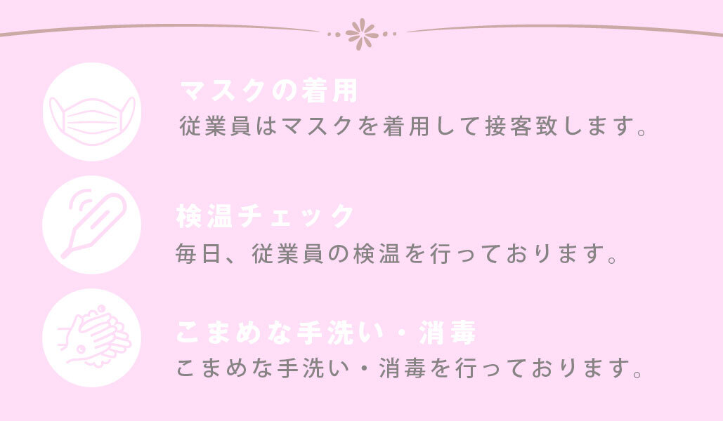 一緒に働いている方たちの安全を守るため、以下の取組を実施いたしております。また、お客さま各位におかれましても感染対策にご協力頂きますようお願い申し上げます。大変ご不便をお掛けいたしますが、ご理解とご協力を賜りますよう心よりお願い申し上げます。